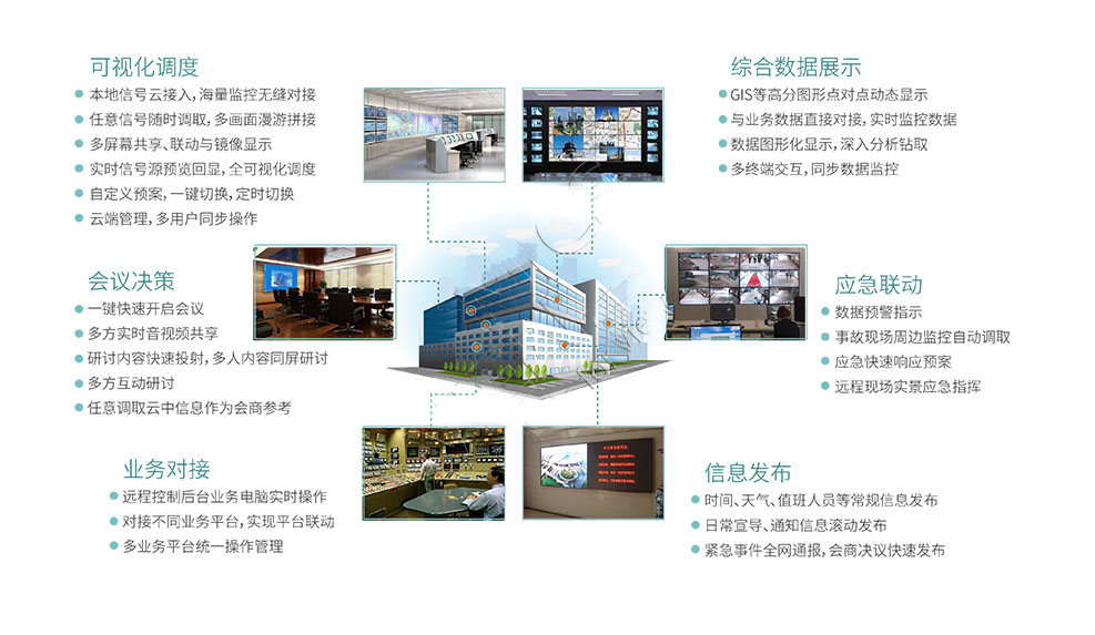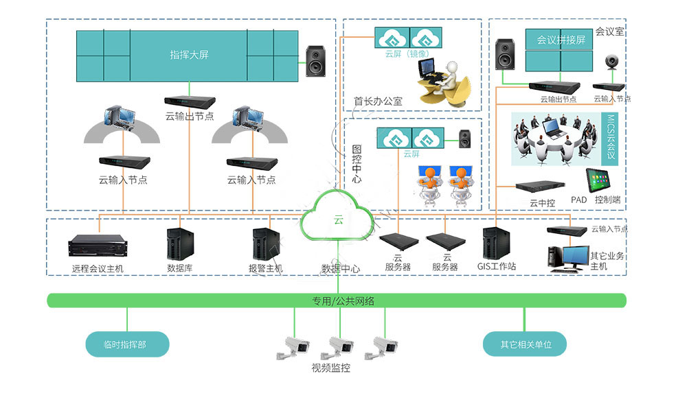 云可实现指挥中心内部所有部门单位乃至跨地域的上下级单位或合作单位间互联互通与可视化信息资源共享,从而将指挥中心内的远程监控、实时指挥、会议决策、应急处理、业务联动、数据分析统计、信息发布等需求以简单灵活的方式实现有机的结合,并可在以后不断的按照新的需要,扩充平台功能。